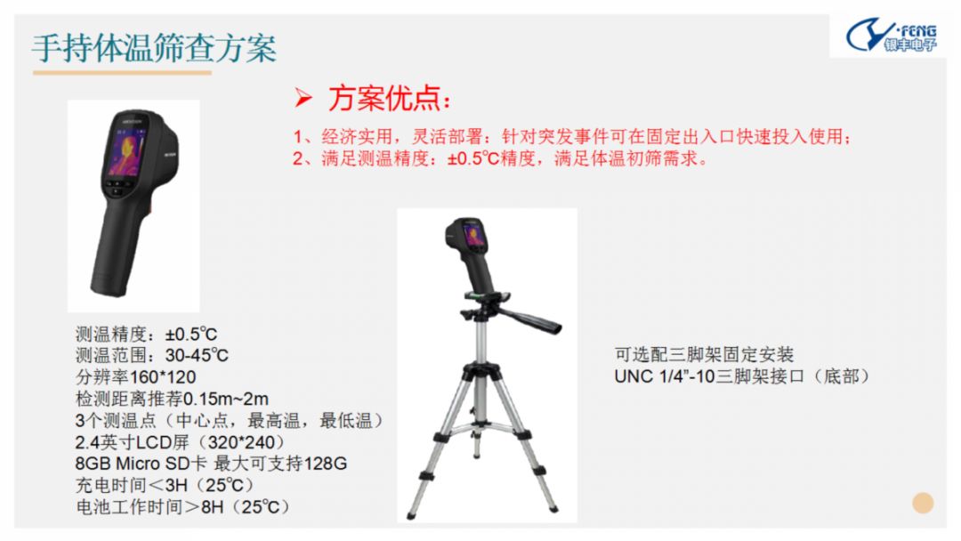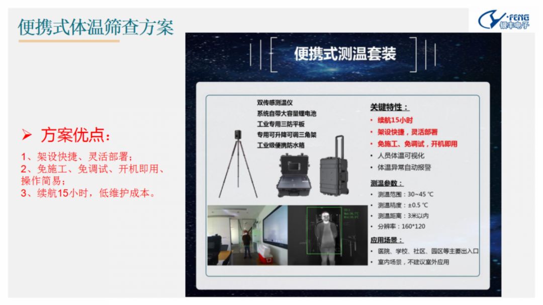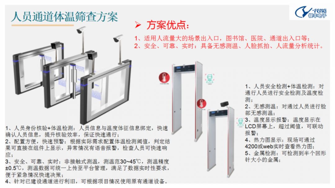 隨著(zhù)春節后工廠(chǎng)復工、學(xué)校開(kāi)學(xué),各地都將迎來(lái)大規模人員流動(dòng),為了對流動(dòng)人員進(jìn)行快速有效的體溫篩查,集團下屬鄭州銀豐電子科技有限公司推出熱成像人體測溫初篩解決方案,該方案依托當下大數據系統、生物識別、熱成像測溫技術(shù)、視頻智能分析及5G等技術(shù)。 熱成像人體測溫初篩解決方案可實(shí)現區域人員識別、精準快速測溫和超溫自動(dòng)報警,助力疫情監控及響應機制的可靠執行。該方案具備“高精度、高效率、低成本、非接觸、靈活布控、安全可靠”等多個(gè)優(yōu)勢。主要模塊均已在部分地區開(kāi)始推廣,具有技術(shù)先進(jìn)性和成熟度。 鄭州銀豐電子熱成像人體測溫初篩解決方案可廣泛應用于“三站一場(chǎng)”交通安全樞紐安檢通道、企業(yè)、園區、醫院、學(xué)校等各類(lèi)出入口及人流量集中的公共場(chǎng)所,對出入人員進(jìn)行體溫篩查同時(shí)可以設置超溫聲光報警進(jìn)行提示。安裝部署靈活,安檢門(mén),通道閘機等各場(chǎng)景均可安裝使用,同時(shí)對未帶口罩識別及客流統計,區域內人群聚集分析,超限后進(jìn)行預警 。 向科技要安全,打贏(yíng)這場(chǎng)戰“疫”。新型冠狀病毒肺炎疫情防控已進(jìn)入攻堅階段,鄭州銀豐電子將全方位、多維度、立體式的搭建疫情防控網(wǎng),以科技賦能疫情防控。 商務(wù)合作咨詢(xún):程女士 聯(lián)系電話(huà):15737170899